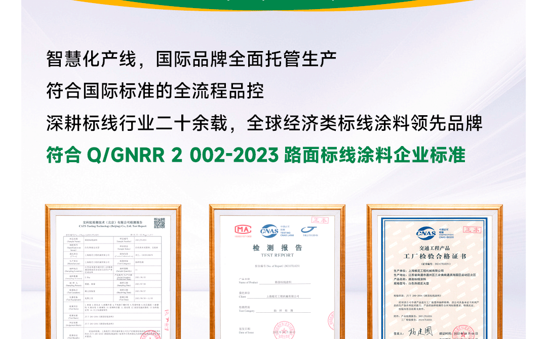 ?專(zhuān)家測評:涂料特點(diǎn):結構合理、混合均勻、質(zhì)量一致性高 / 玻璃珠含量少 / 用途廣泛,使用方便。執行標準:中國交通部Q/GNRR 2 002-2023路面標線(xiàn)涂料標準;